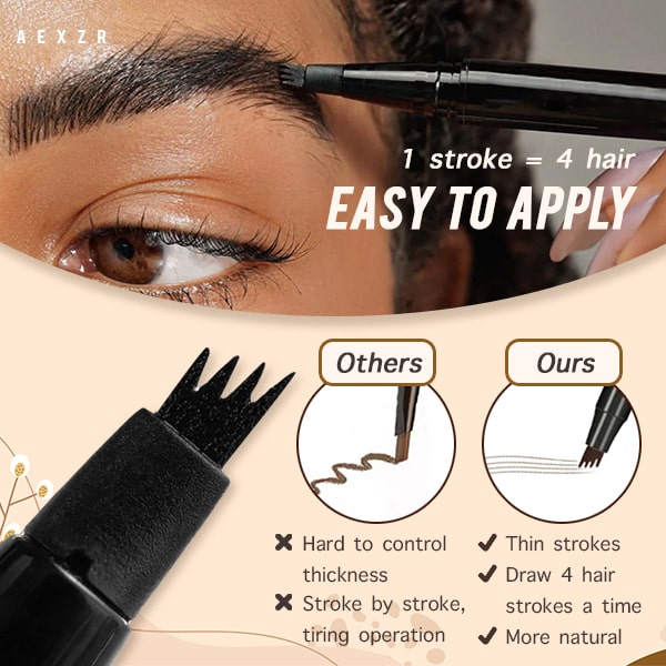 This innovatively designed brow pen features a unique micro-fork tip that creates a vivid, yet light 4 ultra-fine lines in a single stroke. Making it 100% makeup beginner-friendly - Just stroke in the direction of your natural hair growth, no advanced makeup skill required! With this pen, you can easily create tridimensional effects and natural-looking brows by instantly filling and blending seamlessly with your real hairs. An efficient, quick-morning solution to outline the brows and draw the shortest hairs for the effect of microblading brows WITH JUST A FEW STROKES!
