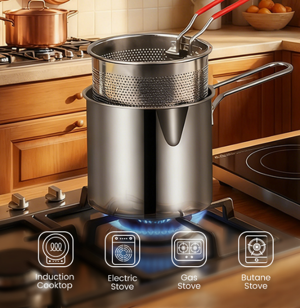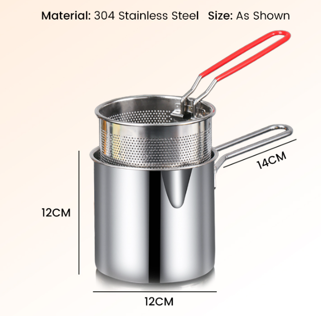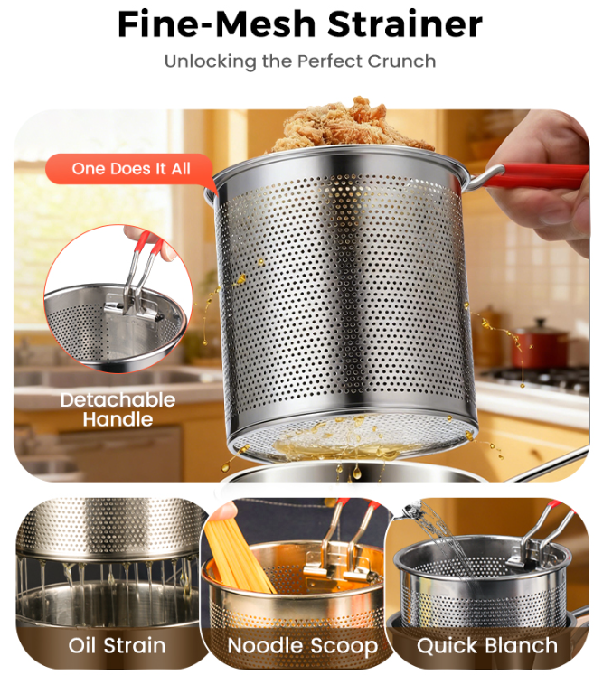 ★【Multi-purpose Use】: The fryer with strainer is perfect for French fries, chicken nuggets, squid rings, tempura, shrimp, etc. It can also be used to boil water, milk, tea, cook pasta, noodles and more many. This fryer is compatible with various stoves, such as gas stoves, induction stoves, etc.