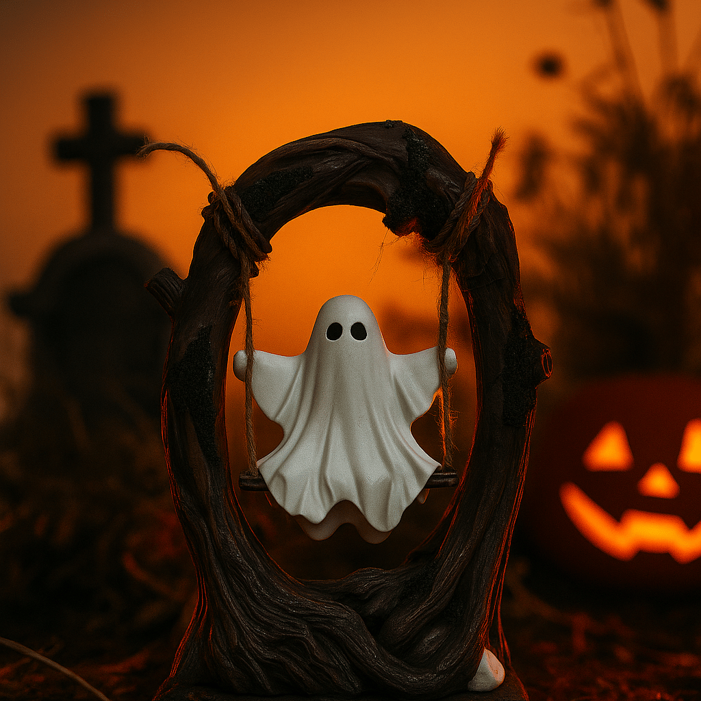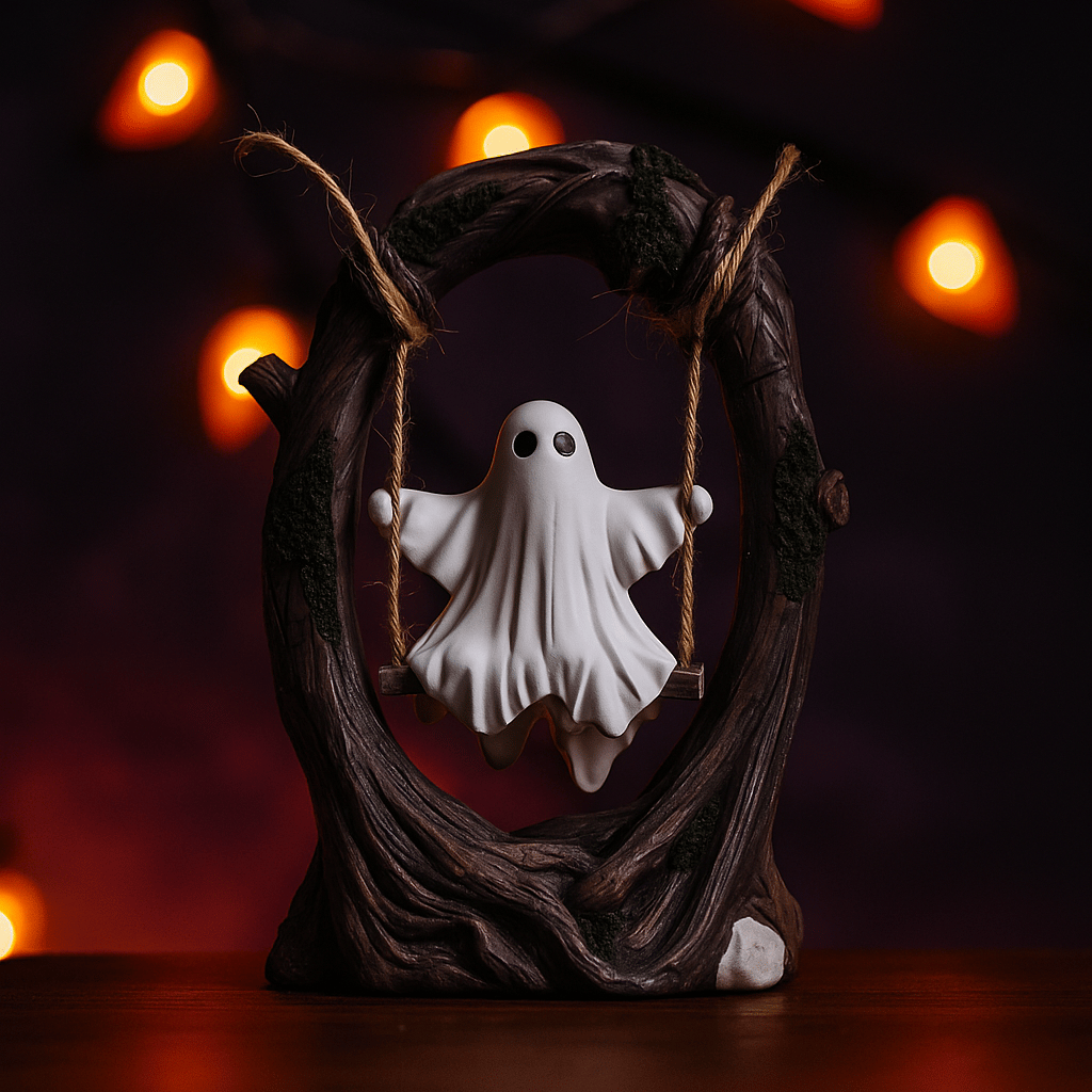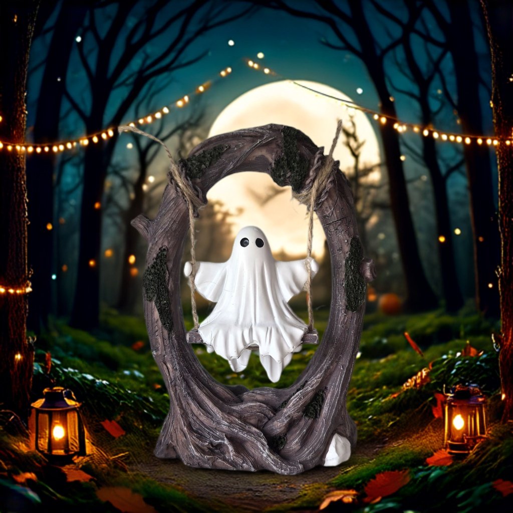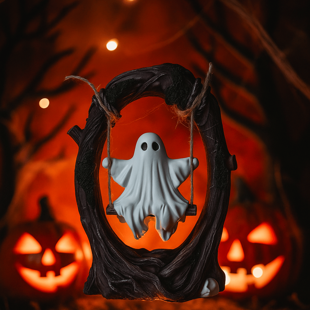 Charming Design:Ā Cute ghost sitting on a tree swing, perfect for Halloween decor.