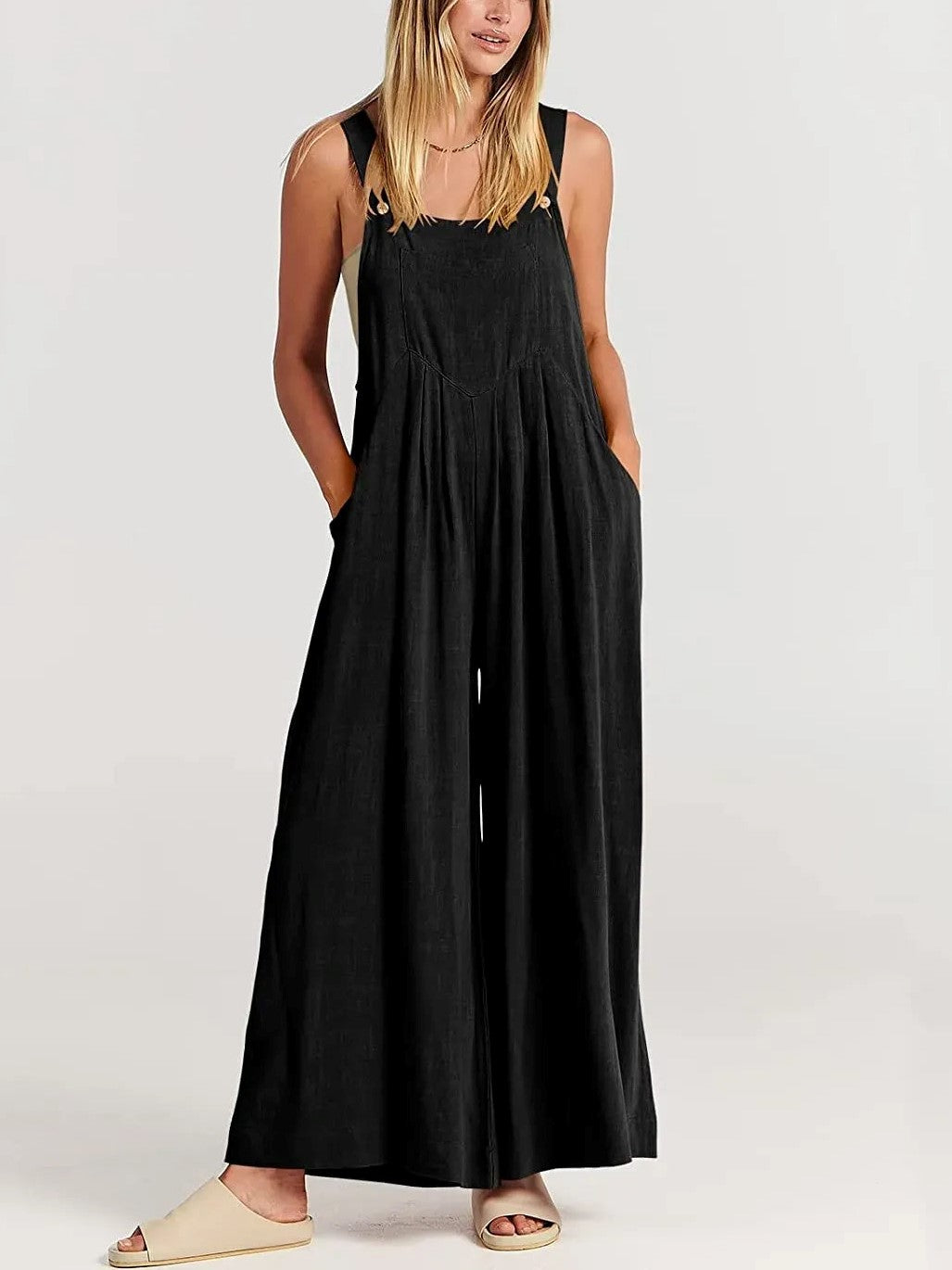 This overalls jumpsuit is designed with adjustable shoulder straps, button detailing, sleeveless style, square neckline, pockets, wide leg pants, is a loose casual fit.