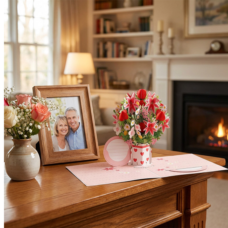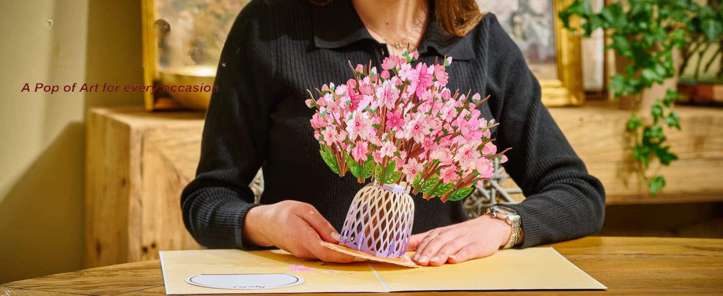 A: The card features an ingeniously engineered pop-up mechanism that springs to life the moment it is opened, unfurling a vibrant 3D cherry blossom bouquet that never fails to captivate and delight. This clever design not only amplifies the cardās visual appeal but also infuses it with an interactive element. Itās perfect for surprising loved ones, turning the simple act of opening the card into a memorable experience that outshines ordinary flat greeting cards.
