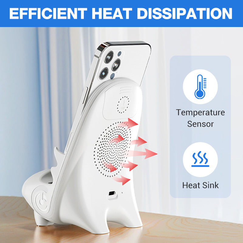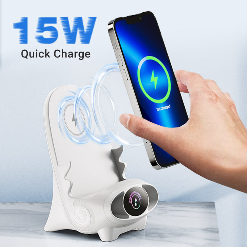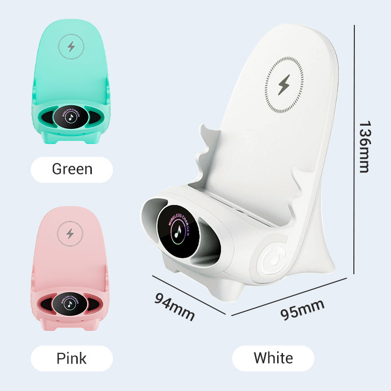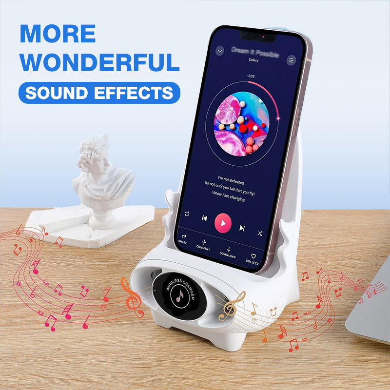 Unique and novel, the wireless charging/mobile phone holder function can be placed horizontally or vertically, and there is a sound hole at the bottom to make the sound more three-dimensional when the phone is playing.