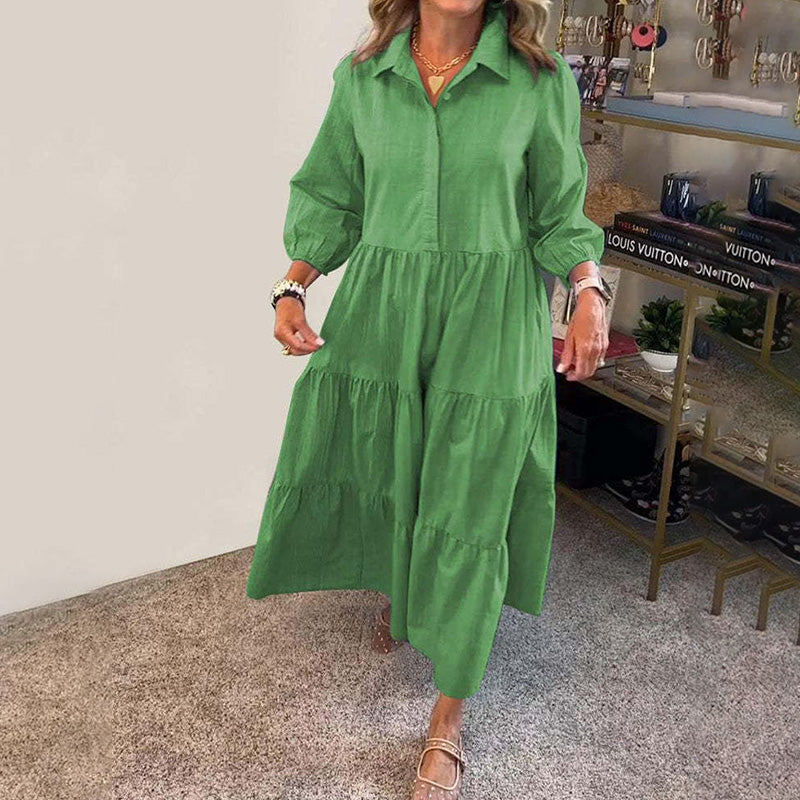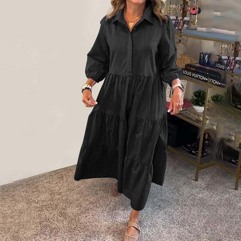 CLASSIC LAPEL COLLAR – The clean-cut lapel neckline lends a timeless, structured charm to the overall relaxed dress design, adding just the right touch of elegance for both casual and semi-formal settings.